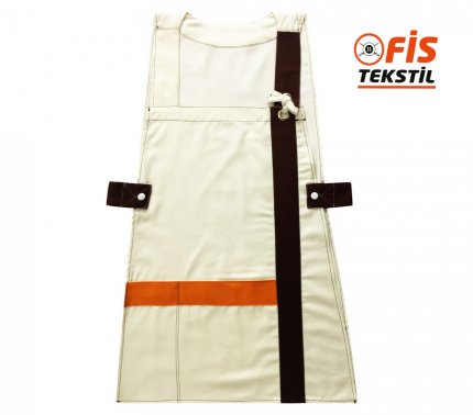 Giyilebilir önlükSol göğüste dekoratif kurdelaBoyundan askılı ve belden bağlamalıÖn bölümde iki renk dekoratif şeritlerÖnde iki cepBoyut : 32 cm (üst en), 51 cm (alt en), 82 cm (boy). Bel kemeri dahil değildir.