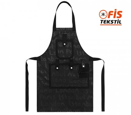 Kullanışlı tasarımBoyundan askılı önlükAna kumaş; şehir isimleri desenli suni deri